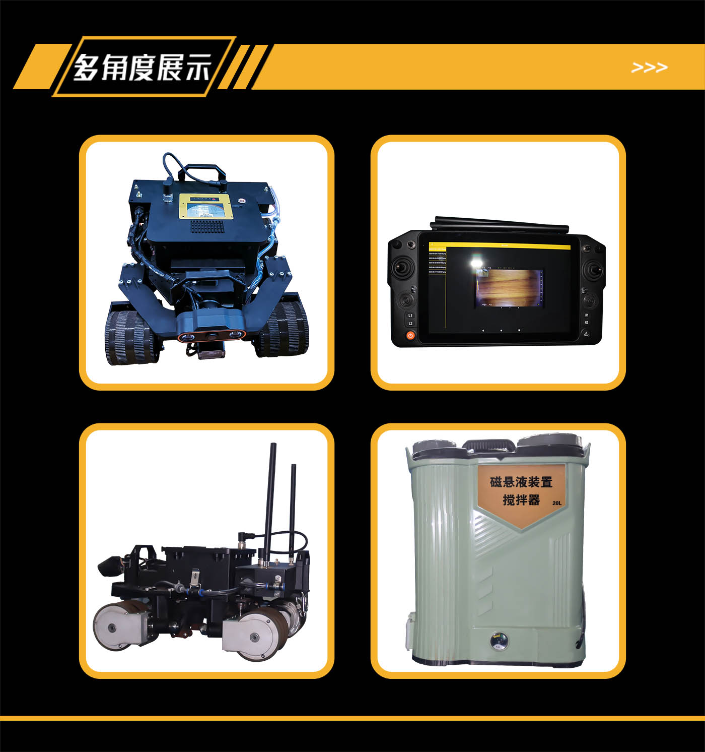 集成無(wú)線、有線兩種供電與控制方式控制機(jī)器人運(yùn)動(dòng)和檢測(cè),遙控器端集成高清彩色屏幕,能夠?qū)崟r(shí)查看檢測(cè)區(qū)域及行進(jìn)方向前側(cè)的圖像信息,并且機(jī)器人搭載高精度浮動(dòng)升降平臺(tái),能夠?qū)崿F(xiàn)檢測(cè)過(guò)程中磁軛的自適應(yīng)。適用于大型壓力容器、儲(chǔ)罐等設(shè)備磁粉自動(dòng)化檢測(cè)。