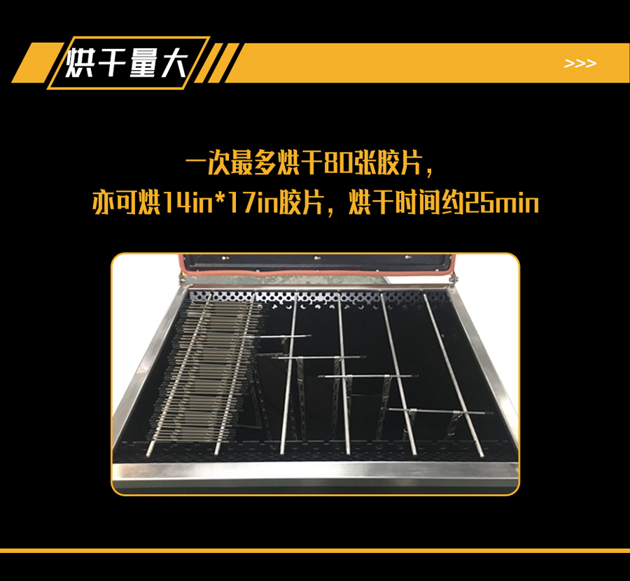 1、一次能烘干80張常規膠片,亦可烘14in*17in膠片,烘干時間約25min;
