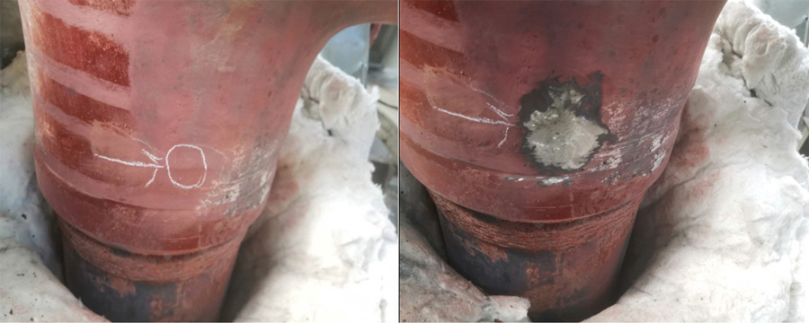 高溫蒸汽閥門應用過程中存在異常,使用ACFM技術進行在役檢測,通過限流方式控制閥門溫度低于350℃,進行檢測。檢測過程發現多處缺陷,以表面裂紋與內部孔砂孔為主,檢測結果經過打磨得以驗證,如圖5、6所示。