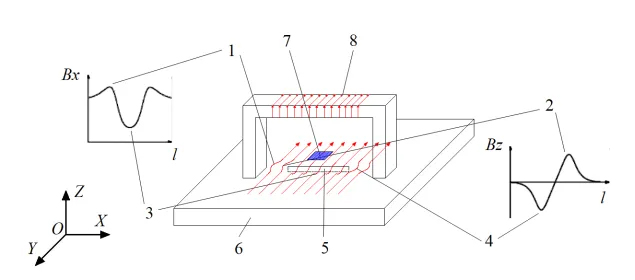 ACFM技術(shù)基于電磁感應(yīng)原理,其核心思想是在被測導(dǎo)體表面施加均勻的交流電流(通常頻率在1-10kHz),電流在遇到缺陷(如裂紋)時會發(fā)生畸變,從而在缺陷周圍產(chǎn)生可測量的磁場擾動,如圖1所示。
